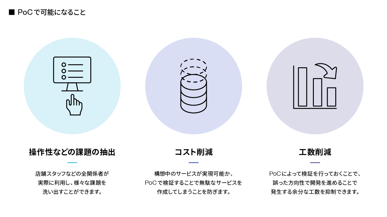 例えば、スマホを用いてお客様自身で決済できる仕組みを構築するなど、昨今では流通小売業の企業でもさまざまなシステム導入が進んでいます。そのようにDXが推進されていくなかで、システム開発においてはPoC(Proof of Concept=概念実証)を活用して開発を行うことが多くなってきています。