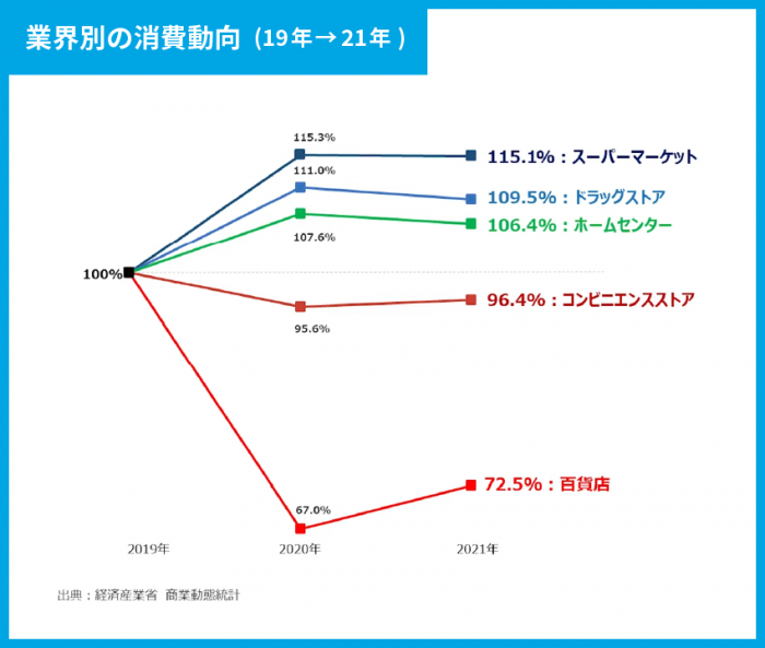 こちらの図は、流通小売業界の各業種・業態における2019年の売上を100%とし、業態別の売上推移をグラフにしたものです。外食が減り、自宅で食事やテレワークをすることが増える中で、スーパーマーケットやドラッグストア・ホームセンターの売上が伸びていることがわかります。一方で百貨店は72.5%となり、消費者が百貨店でお買い物をする機会が大きく減少していることが見て取れます。