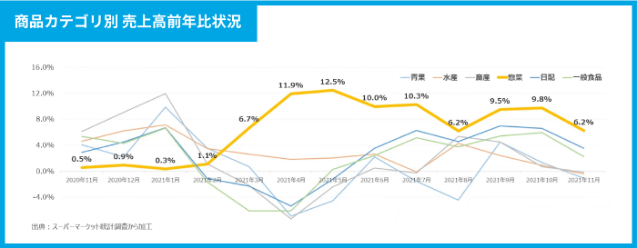 次に、好調なスーパーマーケットの中でどのようなカテゴリの商品の売上が伸びているのかをご覧ください。