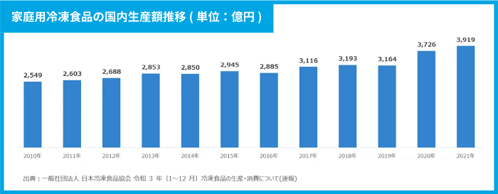 こちらは家庭用冷凍食品の国内生産額の推移をグラフにしたものですが、2010年から2021年まで右肩上がりで伸びています。冷凍技術が発達して冷凍食品が非常に美味しくなっており、冷凍食品に特化した店舗やECも登場している中で、消費量が年々伸びていることがわかります。