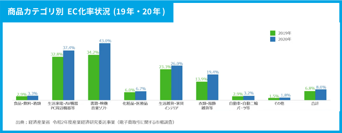生活家電や書籍などは従来からECで購入している人が多かった中で、近年はさらにECで購入する人の割合が増えていることがわかります。一方で、食品・飲料や化粧品・医療品などはほとんど変化が見られません。