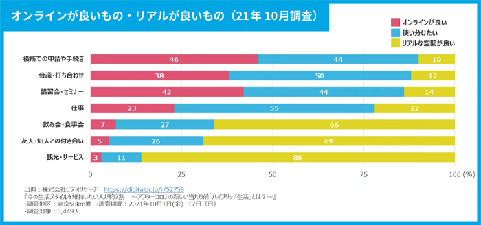 こうした結果は、お買い物の手段だけでなく、普段の生活の仕事や人付き合いにおいても、多くの方がオンラインとリアルを上手く使い分けていることを示しています。