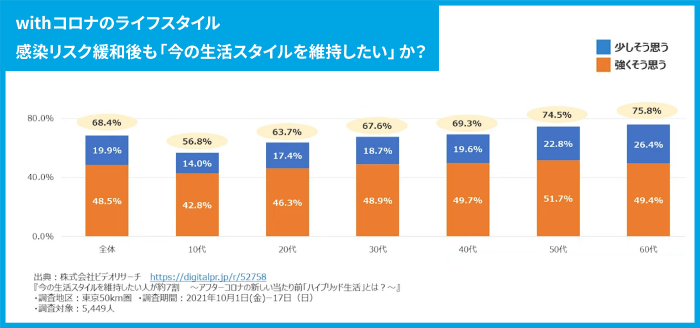 上のグラフを見ていただくとわかる通り、全世代において、コロナ禍の中で定着した生活スタイルを継続したいと考える方が5割を超えています。そして、年齢層が高くなるほど、その傾向は強くなっており、60代にいたっては75.8%もの方が現在の生活スタイルを継続したいと回答しました。年齢を重ねるほど生活スタイルを変えるのは大変なので、一度定着したスタイルを継続していきたいと考えているのではないでしょうか。