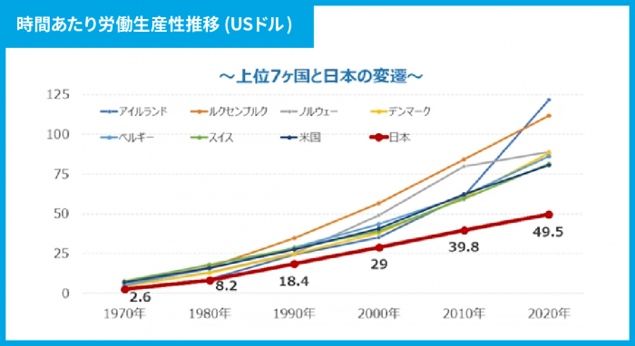 このグラフは、1970年から2020年までの労働生産性の伸びを示したものです。このグラフを見ていただければわかりますが、海外は大きく生産性が高まっているのに対して、日本の伸びは非常に緩やかです。