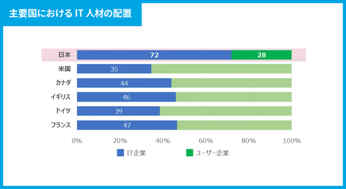 まずひとつ目が、DXを進めるにあたってIT人材がユーザー企業側にいるのか、IT企業側にいるのかという点です。上のグラフの通り、日本以外の主要国ではユーザー企業側にIT人材が在籍しています。一方で日本は7割以上においてIT企業側に人材がいる状況です。