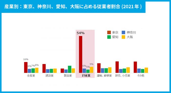 最後に、IT技術者がどこにいるのかを示したグラフをご覧ください。上のグラフを見ると、IT業界の人材は他の産業に比べて著しく東京に集中していることがわかります。実に50%を超える技術者が東京に集中しています。