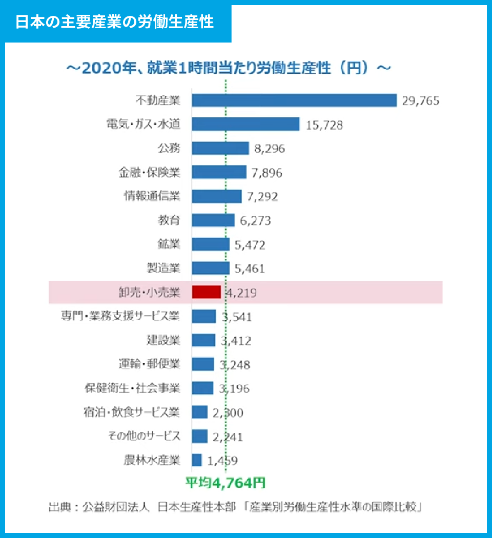 こうした調査結果からは、海外と比べて労働生産性の低い日本の中で、小売業はその平均よりも低いということがわかります。