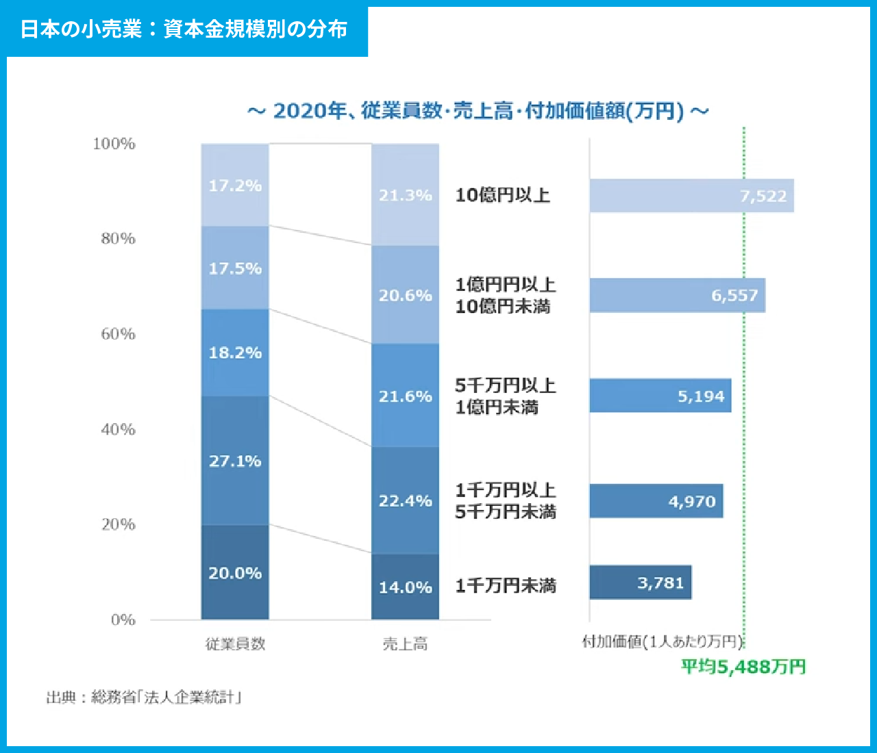 こちらのグラフは、日本の小売業の企業を資本金別に分け、それぞれの従業員数や売上高が全体に占める割合を示したものです。