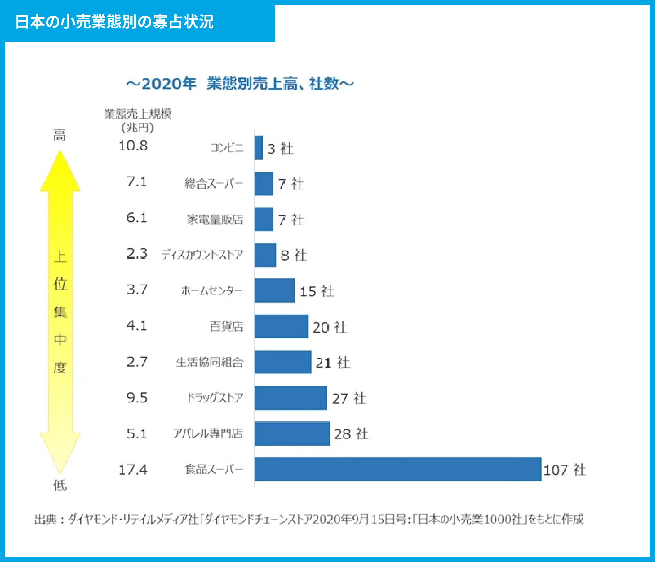 一方で、食品スーパーマーケットは、上位107社の売上を合算しないと全体の80%に達しません。M&Aが近年活発に行われているドラッグストアも、この調査の時点では27社となっています。こうした食品スーパーマーケットやドラッグストアの状況を見ても、日本の小売業はまだ中小企業が多いことがわかります。