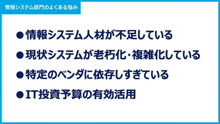 まずは人手不足。情報システム部門の人材が足りないという課題を、多くの企業が抱えています。そして次に、システムの老朽化や複雑化が店舗運営の効率化などを妨げているという問題。そして、特定のベンダーへの依存です。ベンダーの都合や技術力がさまざまな弊害を生んでしまうのです。