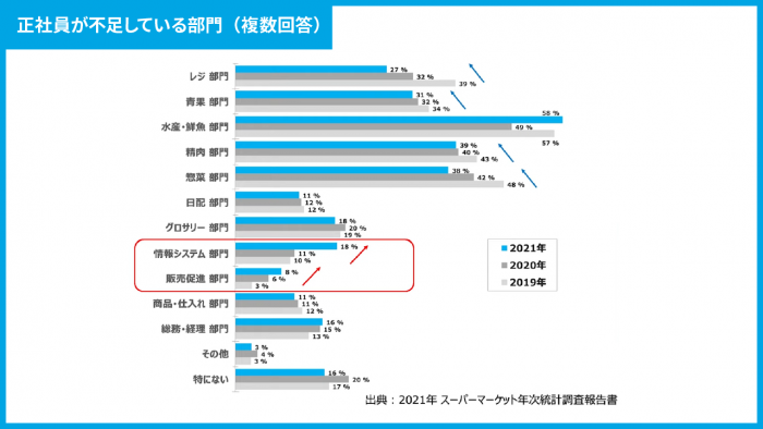 これまで人手不足が深刻だったレジ部門や精肉部門、惣菜部門は2019年から2021年にかけて、人手不足の割合が減少してきています。これは、レジのセルフ化やプロセスセンターの増加が要因として挙げられると思います。