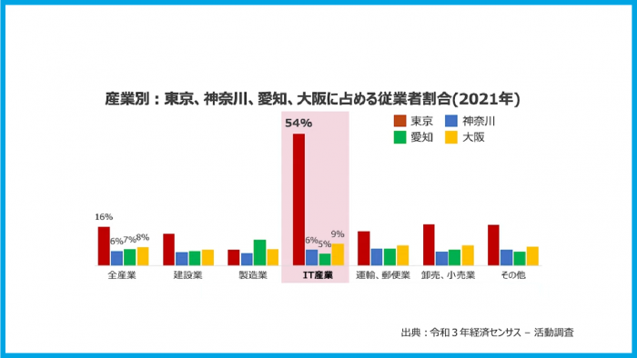 次に、IT人材がどのエリアにいるのかを示したグラフです。日本のIT人材が東京に極端に集中していることが示されています。