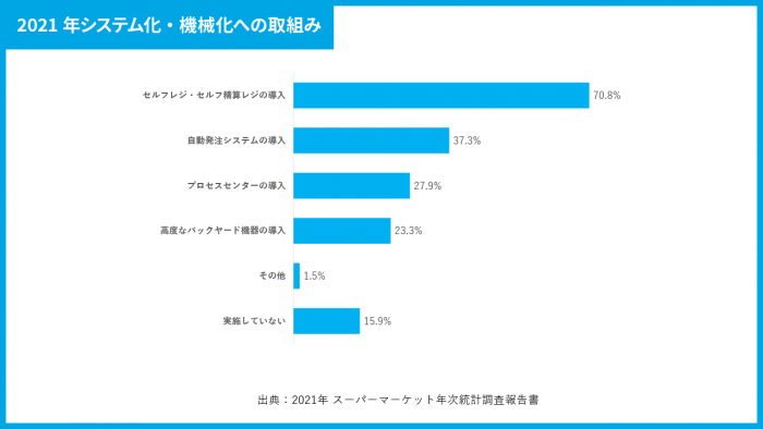 コスト削減を進めている分野としては、主にレジ業務、発注業務、品出しなどが多くなっています。セルフレジや自動発注の仕組み、プロセスセンターなどの導入に投資することで、人員削減や効率化によるコスト削減を実現しているのです。