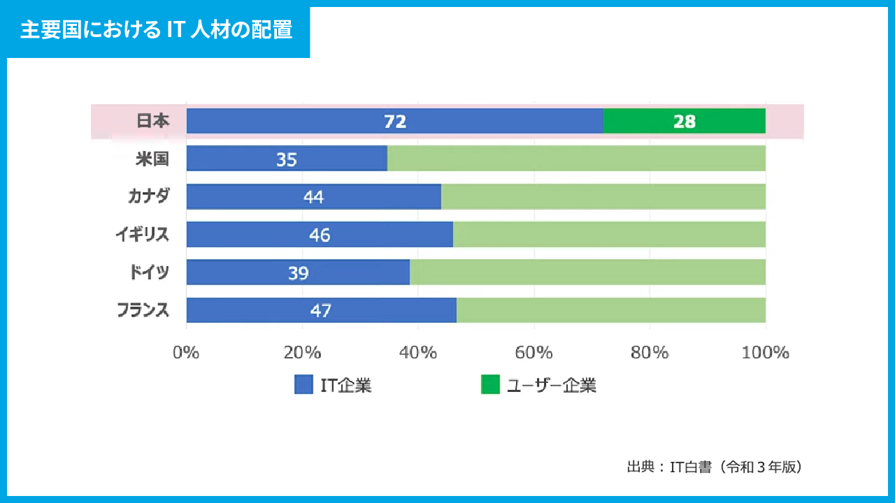 グラフでは、IT人材がIT企業側に在籍しているのか、それともユーザー企業側(事業会社側)にいるのかを示しています。欧米ではユーザー企業にIT人材がいるのに対し、日本においては7割以上がIT企業側にいるようです。