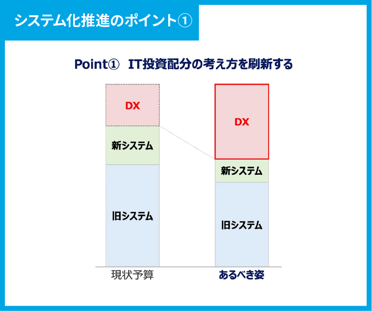 基本的な考え方としては、上の図のように現状のシステムを低コストで運用し、DX分野により多くの予算を割り当てていく必要があります。