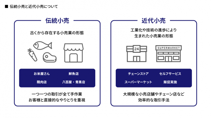 個人経営のお米屋さんや魚屋さんのような古くからある対面販売のお店を伝統小売と言います。それに対し、スーパーマーケットやコンビニエンスストアなどを近代小売と呼びます。小売業にどのような変革が起こり、近代小売が誕生したのか。その歴史をこれからご紹介していきます。