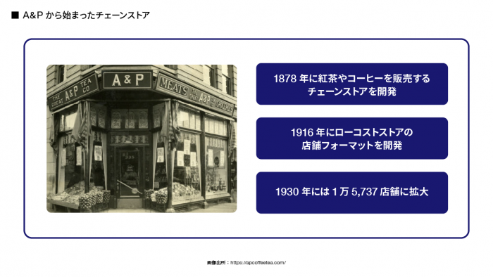 近代小売の始まりはチェーンストアからと言われています。紅茶やコーヒーを販売していたA&P(The Great Atlantic&Pacific Tea Company)という小売店が、1916年に「エコノミーストア」というローコストの店舗を開発したことが、近代小売の起源となったのです。
