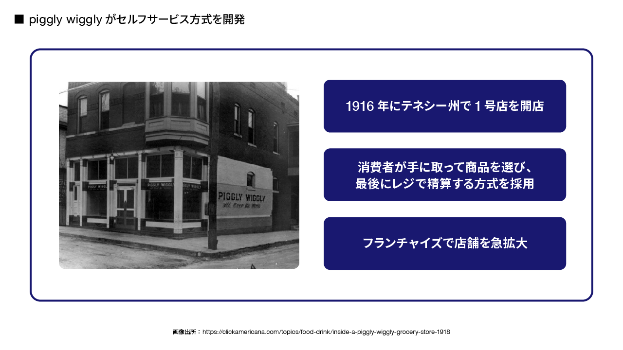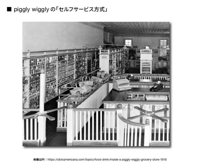次に、セルフサービスについてご紹介します。セルフサービスの起源となったのは、1916年に誕生したピグリー・ウィグリー(piggly wiggly)です。