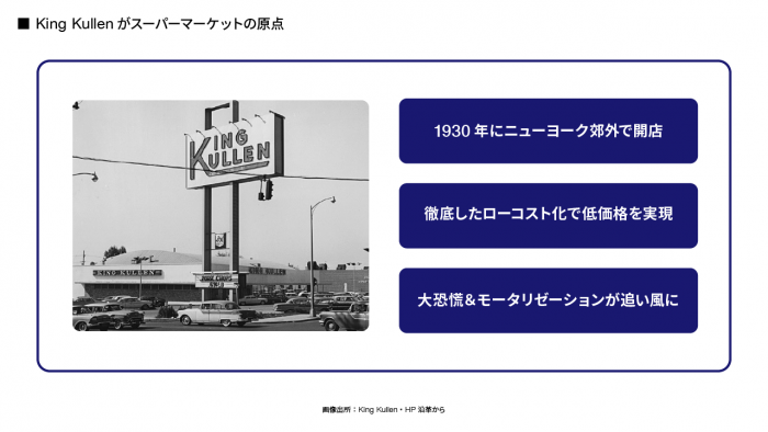 続いて、現代に生きるみなさんにとって非常に馴染みのあるスーパーマーケットについてご紹介します。スーパーマーケットを発明した人物はマイケル・J・カレン。ニューヨーク郊外でキング・カレン(King Kullen)というお店を開業しました。