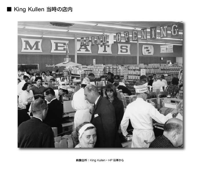 広大な駐車場も備えた大型店舗でセルフサービスを採用し、生鮮食品も販売。店員による接客廃止や内装・外装の簡略化、商品を箱のまま陳列することなどによって、大幅な低価格化を実現しました。1937年にはショッピングカートが使われ始めたと言います。