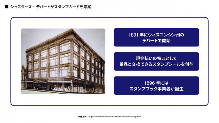 最後に、販促の始まりについて触れたいと思います。販促施策の起源は、1891年にシュスターズ・デパート(The Schuster and Company Department Store)が始めたスタンプシールと言われています。