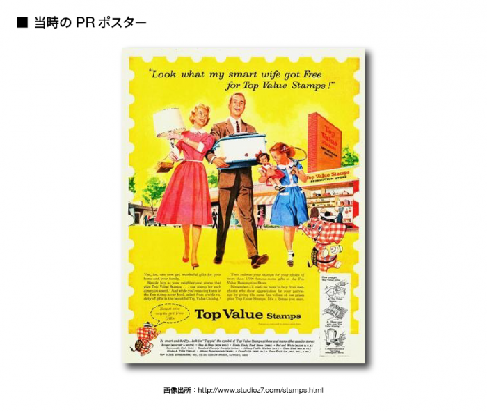 これはスタンプシール制度をPRする当時のポスターです。スタンプを貯めて無料で景品と交換した家族が、その景品を自慢している姿を描いています。