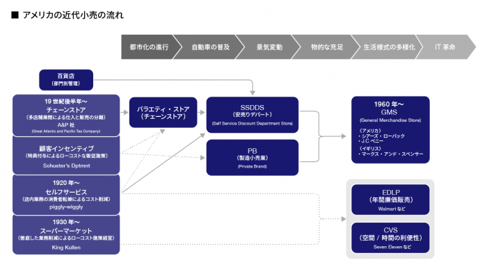 こちらは、アメリカの近代小売の成り立ちをまとめた図です。やはり近代小売への変革を考えるうえでは、チェーンストアやセルフサービス、スーパーマーケットの誕生が大きなターニングポイントになっています。