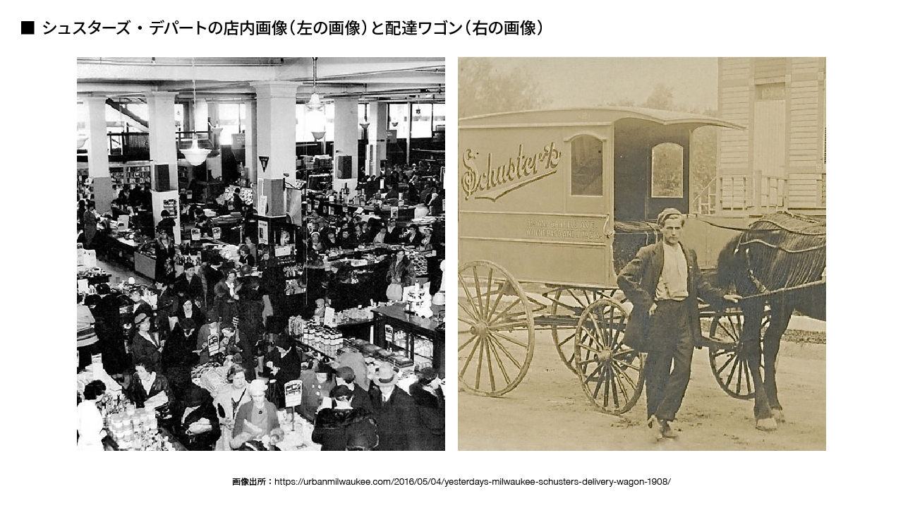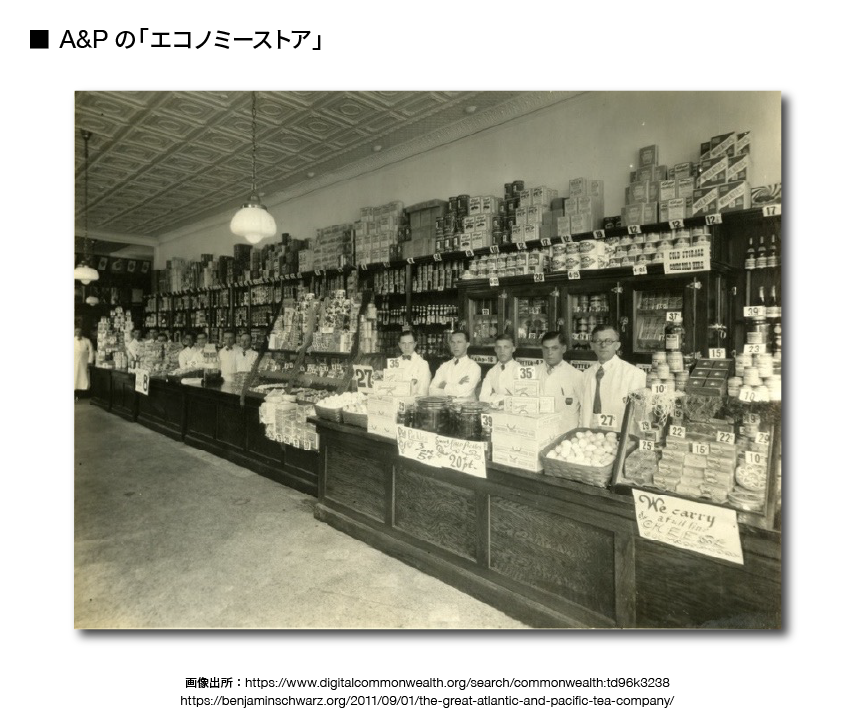この写真を見てわかるとおり、A&Pの「エコノミーストア」は店内にカウンターがあり、そのなかにいる店員に声をかけて商品を購入する対面型の店舗です。ただし、お店の形態や運用を規格化して多店舗展開し、共同での仕入れによってコストを抑えることで低価格で商品を販売できました。店舗オペレーションの標準化、仕入れと販売の分離などを進め、運営の効率化やコストダウンを実現したのです。