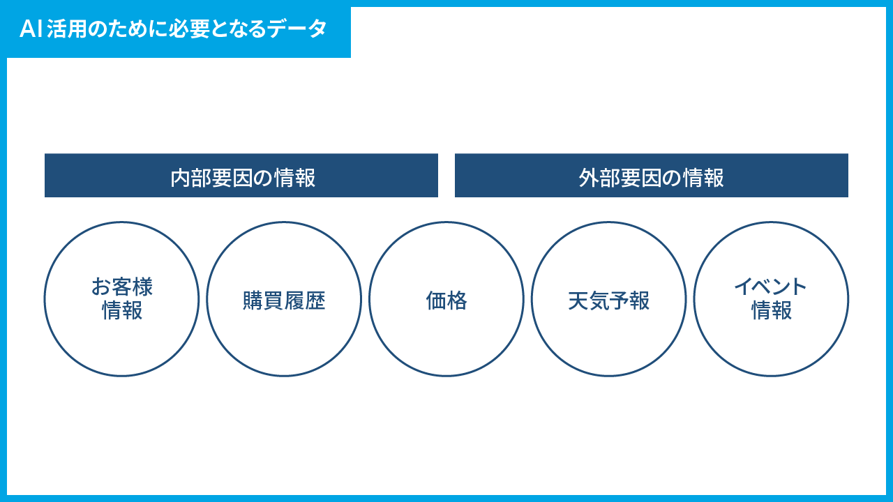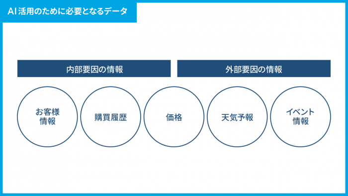 AIを活用する上で必要になるのがビッグデータです。お客様の購買履歴や属性・商品の価格・天気予報・近隣でのイベントなど、さまざまな情報を収集・蓄積し分析×活用することで、「小売業のDX」を推進することが可能になります。