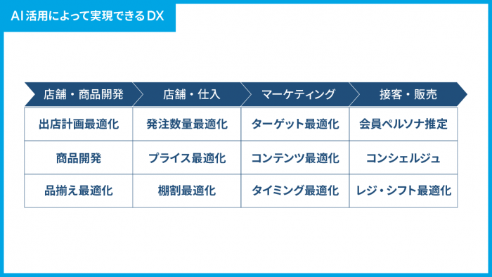 では、AIによる分析で、小売業ではどういった分野でDXが可能になるのかを見ていきましょう。