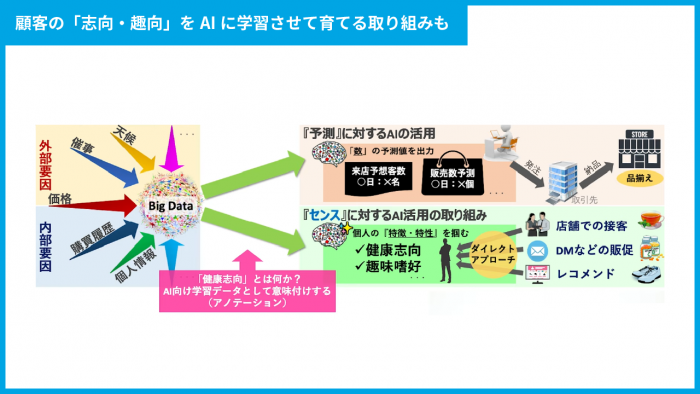 店舗にご来店されるお客様の志向や嗜好を分析し、そうした「センス(感覚)」の領域に関する学習データをAIに「意味付け」すれば、店舗での接客やDMなどの販促活動、レコメンド情報の最適化まで高度化することが今後可能になります。