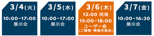 | 開催日時 | 2025年3月4日(火) ~ 3月7日(金) 10:00 ~ 17:00 (最終日のみ16:30) |