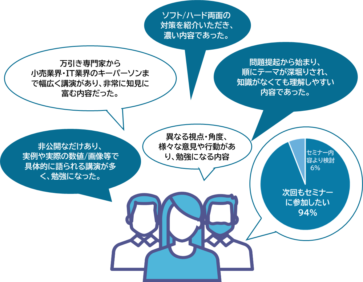 本セミナーではその万引き問題に目を向け、専門家や研究者・小売業様により「現場の実態と対策」のご講演をいただいたほか、IT企業からは先端テクノロジーを活用したアプローチについて発表いただきました。